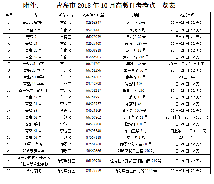 二、2018年10月青岛自学考试地点:以准考证为准。本次考试全市共设22个考点(详见附件:青岛市2018年10月高教自考考点一览表)。